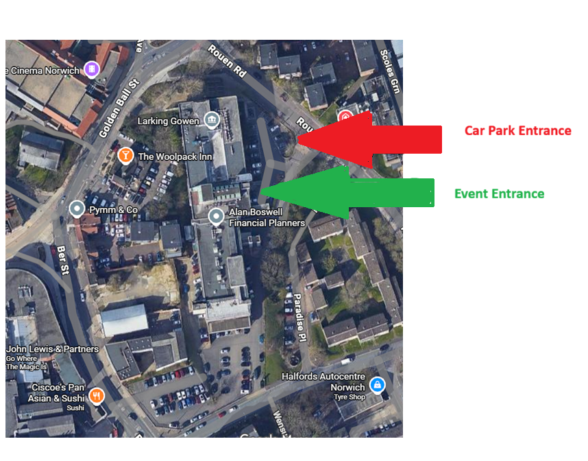 Parking available on site only between 2.00-2.15. Outside of these times other (paid) car parks are available (Castle Mall and Thorn Lane next door). The entrance is via the side of Prospect House, Rouen Road, Norwich, NR1 1RE. Details as per below